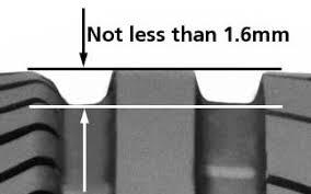 No cuts or bulges, 1.6mm of tread depth across the central 3/4 of the breadth of the tyre and around the entire circumference.